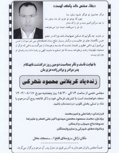 تصویر زیر آگهی ترحیم محمود شهرکی است: