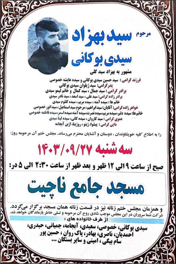 سازمان حقوق بشر ایران؛ ۲۷ آذر ۱۴۰۳: حکم یک زندانی کُرد به‌نام بهزاد سیدی‌بوکانی که با اتهام «قتل عمد»‌ به قصاص نفس (اعدام) محکوم شده بود، در زندان میاندوآب به اجرا درآمد.