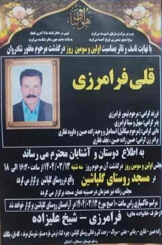 تصویر زیر آگهی ترحیم قلی فرامرزی است:
