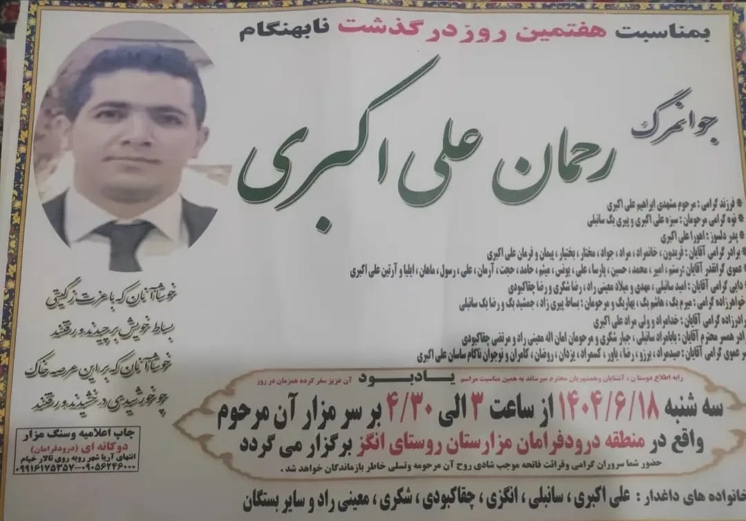 تصویر زیر آگهی ترحیم رحمان علی‌اکبری است: