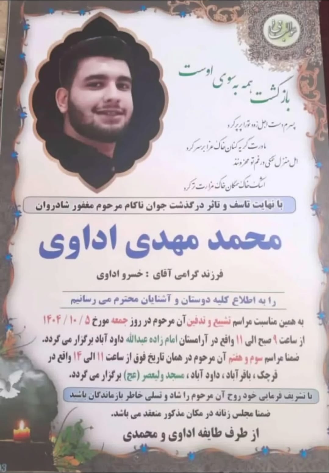 تصویر زیر آگهی ترحیم محمدمهدی اداوی است: