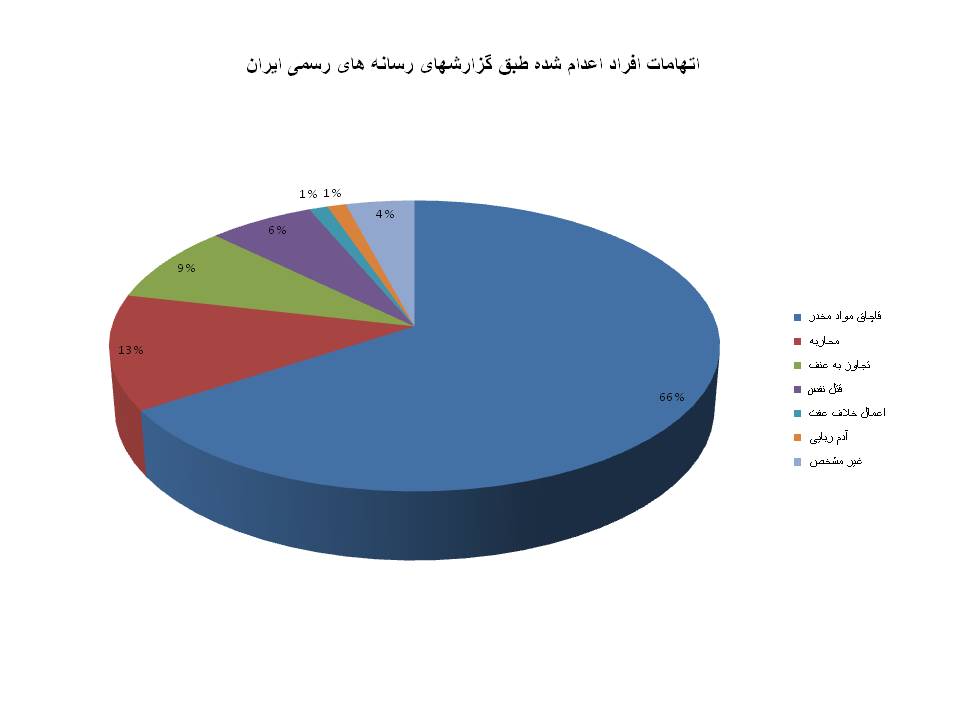 بر طبق گزارش رسانه های رسمی ایران، ۶۶ درصد افراد اعدام شده متهم جرایم مربوط به قاچاق مواد مخدر بودند . اتهام ۱۳ درصد افراد اعدام شده محاربه با خدا ، ۹ درصد تجاوز، ۵ درصد قتل نفس ، یک درصد اعمال خلاف عفت و یک درصد آدم ربایی بود. اتهام ۴ درصد افراد اعدام شده در اخبار رسمی ذکر نشده است. قابل ذکر است که اتهام بیشتر افرادی که طی اعدام های مخفیانه در زندان مشهد به دار آویخته شده اند قاچاق مواد مخدر بوده است. این اعدامها در این نمودار نیستند. باید یاداور شویم که تمامی متهمان قاچاق مواد مخدر در دادگاه انقلاب در پشت درهای بسته محاکمه می شوند.