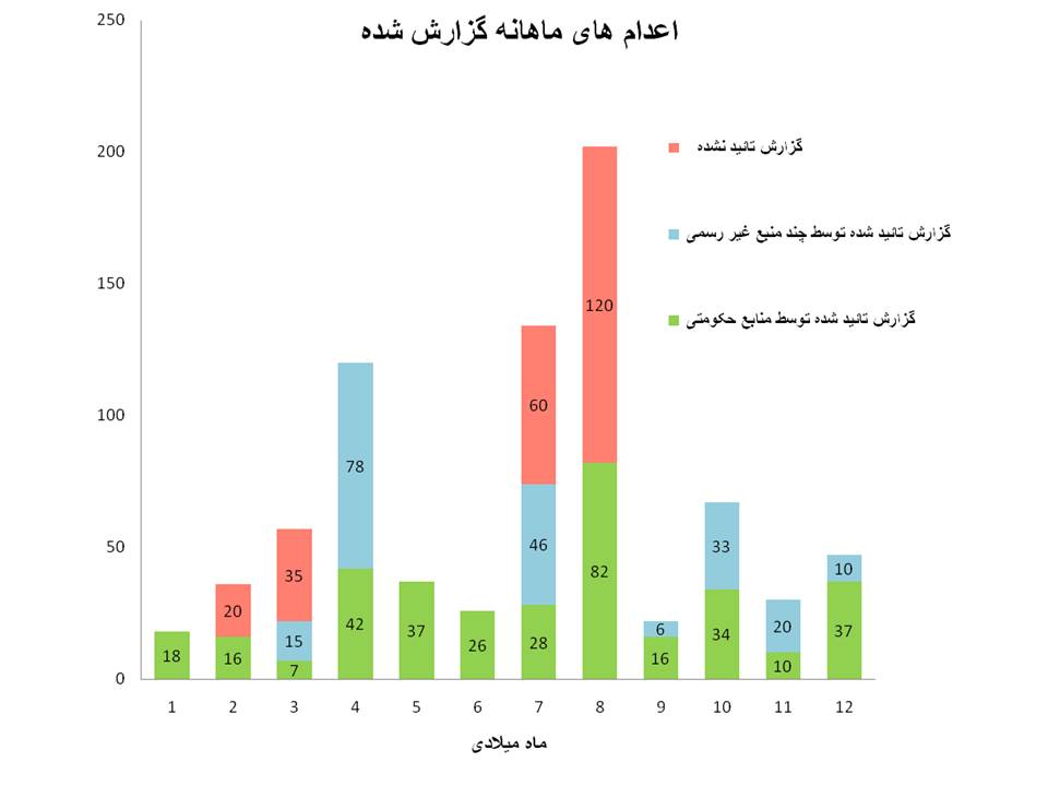 نمودار موجود روند اعدامها در ماههای مختلف سال ۲۰۱۰ میلادی را نشان می دهد. تعدادی که با رنگ قرمز نشان داده شده اعدامهایی است که در این گزارش به دلیل دقیق نبودن تعداد افراد اعدام شده و یا تاریخ اعدام در این گزارش وارد نشده اند . بیشتر اعدامهایی که با رنگ قرمزنشان عدده شده اند در زندان مشهد در ماههای جولای و آگوست ( تیر و مرداد ۸۹ ) اتفاق افتاده اند .