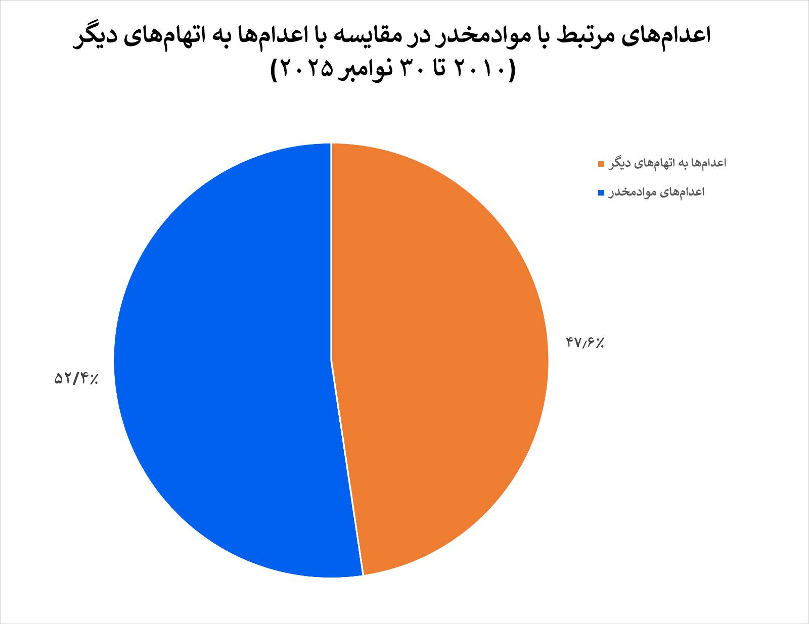 نمودار ۱: اعدام‌های مرتبط با مواد مخدر ثبت‌شده توسط سازمان حقوق بشر ایران بین اول ژانویه ۲۰۱۰ تا ۳۰ نوامبر ۲۰۲۵